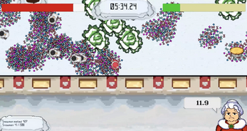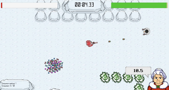Santa Rage and the Candy Cane justice mission is a top-down shooter. Kill the snowmen by shooting them with candy canes or dropping your hot chocolate to melt them. Beware you only have a limited amount of hot chocolate. Kill as many as you can.